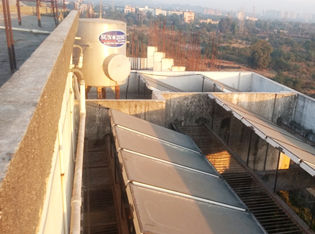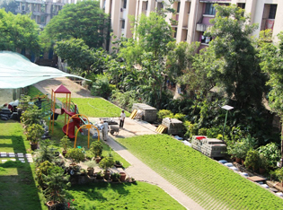 Maximiizing use of grass pavers on internal service road. Material with high solar reflectance index like china mosaic tiles are used roof. Roof area is covered with grass medians and many plant. Solar panels are installed over roof for solar water heating which also minimize heat gain on terrace.